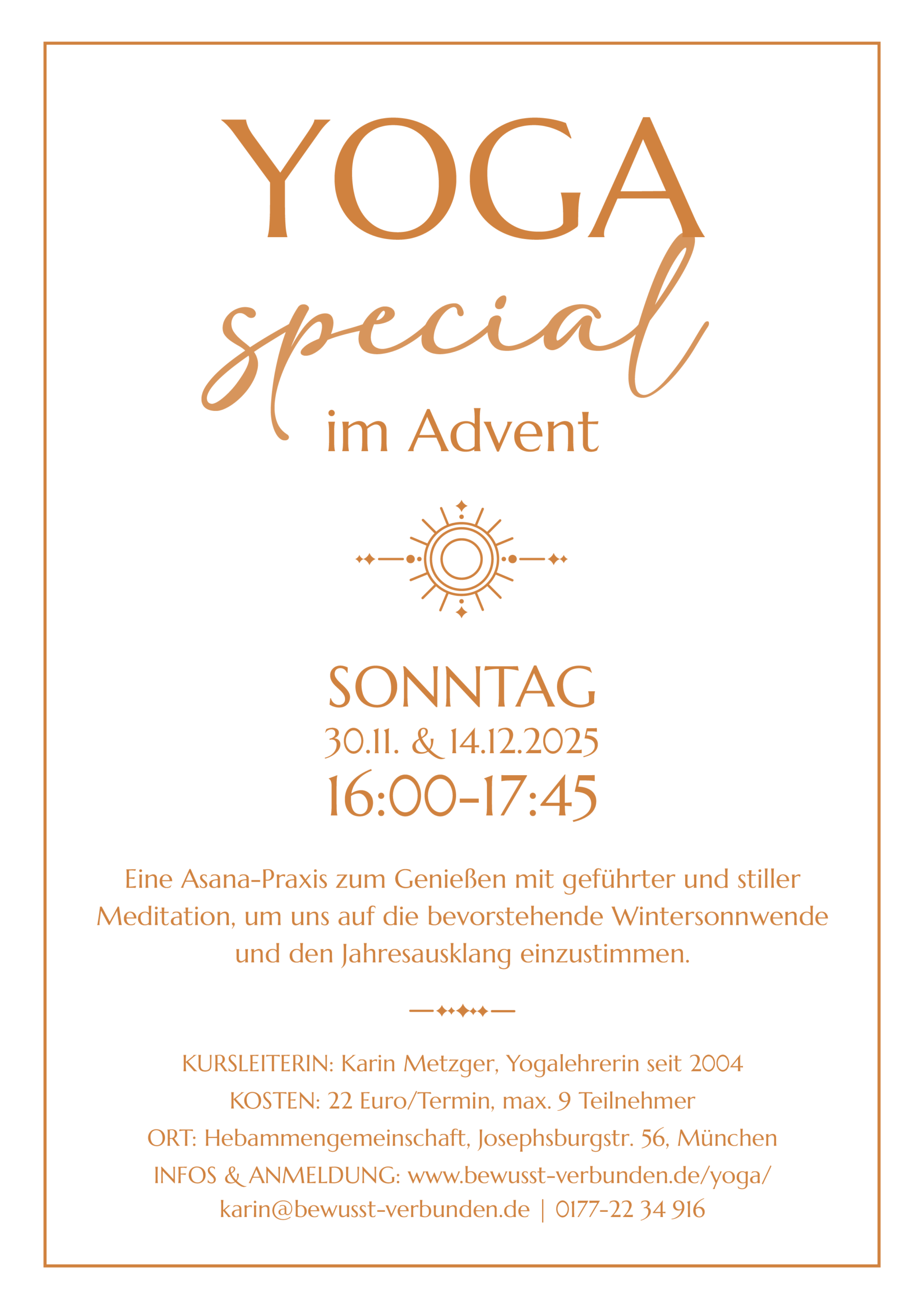 Individuelle Yoga-Begleitung für Einzelpersonen und kleine Gruppen – bei Dir zu Hause im Raum München, oder in einem von mir angemietetem Raum in München Berg am Laim (Hebammengemeinschaft München, U-Bahn Josephsburg).